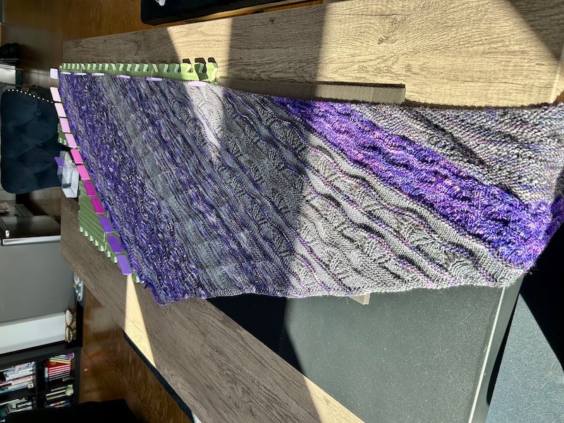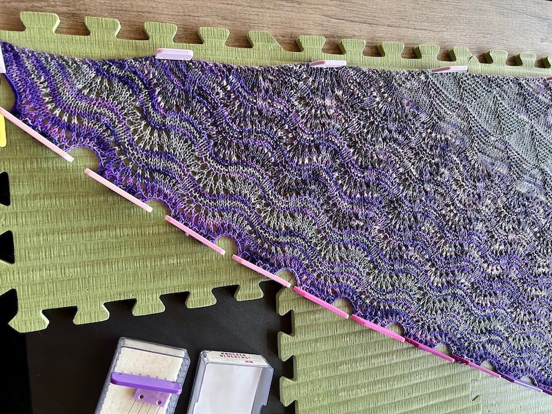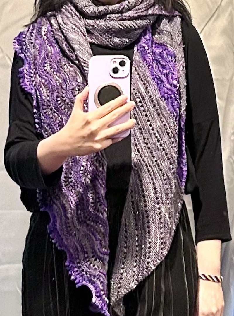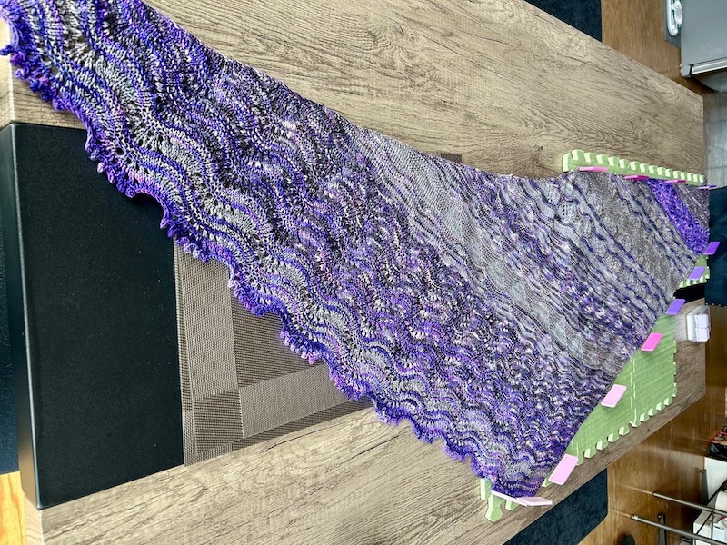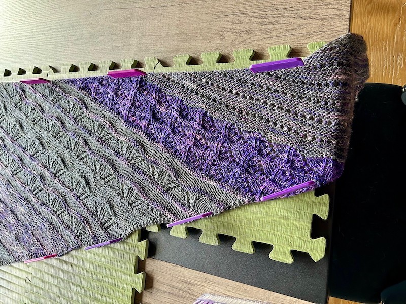 I'm friends with knitwear designer, Noriko Ho. Last spring/summer, she asked for test knitters for her MKAL (mystery knit-a-long) shawl. It took me way too long to knit to be helpful as a test knit for her, but it's finally done! I used US 4 needles, and the yarns I used were Anzula Nebula in Opal (grey with silver sparks!), Koigu Painter's Palette Premium Merino in P439 (bright purples), and Yarnarchy Liberty (muted purples and grey). I love the alternating mix of patterns and colors. The result is subtly and pleasingly complex but so big I had to block half of it at a time.